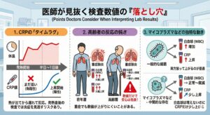 高齢の方は、重症の肺炎でも白血球やCRPがあまり上がらないことがあるため、数値だけで安心はできません。