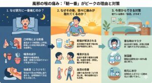 ・唾液の減少: 睡眠中は、喉を守ってくれる「唾液」の分泌量が激減します。これにより、喉の粘膜を保護・修復する力が弱まり、ウイルスや乾燥のダメージを直接受けやすくなります。