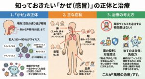 ・治すのは自分: 最終的にウイルスを排除して体を治すのは、あなた自身の免疫力です。薬で体を楽にしつつ、栄養と睡眠をとって免疫が勝つのを待つのが「風邪の治療」です。