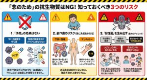 ・いざという時に効かなくなる: 将来、本当に肺炎や膀胱炎、あるいは大きな手術が必要になった時に、「どの抗生物質も効かない」という命に関わる事態を招く恐れがあります。