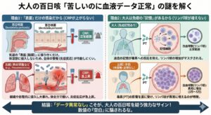 ・症状の違い: 大人が再感染した場合、子供のような「ヒューヒュー」という特徴的な音が出ないことが多く、**「長引くしつこい咳(咳喘息だと思っていたら実は百日咳だった)」**という形で現れることが多いです。