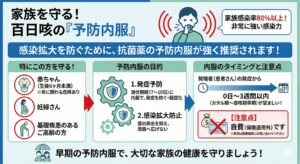百日咳は非常に感染力が強く、一緒に生活している家族には8割以上の確率でうつると言われています。 特に、ご家庭に以下の**「重症化リスクの高い方」**がいらっしゃる場合は、抗生物質(マクロライド系)を予防的に内服することが重要です。