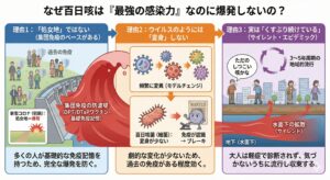 潜伏期間の長さと、その後の初期症状(カタル期)の特徴が合わさることで、**「感染拡大を食い止めるのが非常に難しい」**という厄介な問題が生じます。