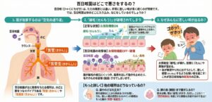 菌の感染自体は、鼻やのど(上気道)から始まります(風邪のような症状が出る「カタル期」)。 しかし、百日咳特有の「あの苦しい咳」を引き起こす原因となるメインの戦場は、そこよりも奥にある「気管・気管支」です。
