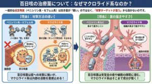 多くの抗生剤(ペニシリンなど)は、バイ菌の体を守る「壁」を壊して退治します。しかし、百日咳菌はこの「壁」への攻撃に対して抵抗力を持っています。そのため、壁ではなく、菌の活動そのもの(タンパク質の合成)を止める「マクロライド系」という種類の抗生剤を使う必要があります。
