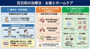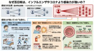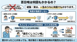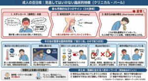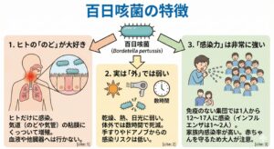 ・症状の違い: 大人が再感染した場合、子供のような「ヒューヒュー」という特徴的な音が出ないことが多く、**「長引くしつこい咳(咳喘息だと思っていたら実は百日咳だった)」**という形で現れることが多いです。