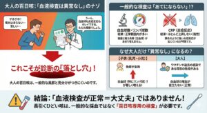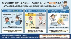 ・**長引く咳(2〜3週間以上)**が続いたら、成人でも百日咳の可能性。