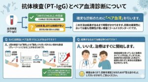 ・発症から3-4週以降 ; 血液検査:PT-IgG 100 EU/mL以上で陽性
