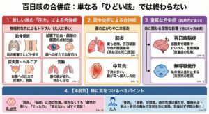 百日咳は単なる「ひどい咳」では終わりません。激しい咳が長く続くことで、体に大きな負担がかかり、様々なトラブル(合併症)を引き起こすことがあります。