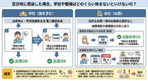 ・学校等の扱い:学校保健安全法では、百日咳は「特有の咳が消失するまで、または適正な抗菌薬投与後5日経過まで」出席停止。