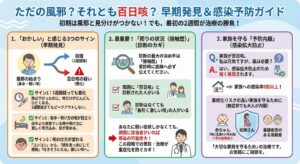 百日咳は、激しい咳が長期間続くつらい病気ですが、その始まりは鼻水や軽い咳といった**「普通の風邪」と全く見分けがつきません。**