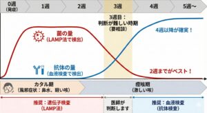 百日咳を確定診断するための遺伝子検査(LAMP法など)は、菌がいる時期(発症から2〜3週間以内)に行わないと、陽性が出にくくなります。 「咳がひどくなってきたから病院へ行こう」と思った頃には、すでに菌が消えていて、検査ですり抜けてしまう(偽陰性になる)ことが多いのです。