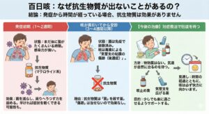 ここが非常に厄介な点で、特効薬となる抗生物質(マクロライド系)は、この**「風邪に見える初期段階(最初の2週間)」に飲み始めないと、咳を軽くしたり期間を短くしたりする効果が期待できない**のです。
