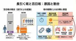 ・慢性咳嗽(8週間以上): 8週間を超えると、咳喘息、副鼻腔気管支症候群、逆流性食道炎などが主要な原因(欧米や日本のガイドラインではこれらが「3大原因」とされる)となり、感染症の割合は相対的に下がります。 しかし、百日咳は「100日咳」という名の通り、数ヶ月続くこともあるため、慢性咳嗽の原因としても決して無視できません。